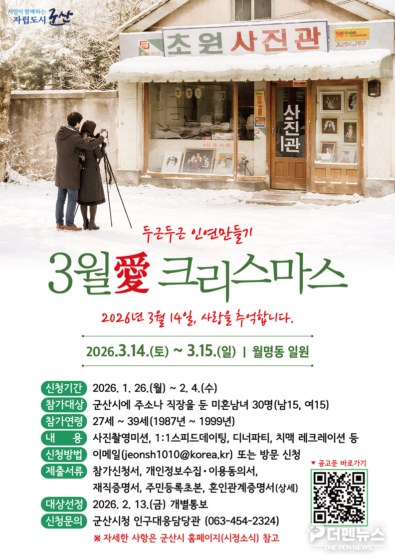 군산시가 바쁜 일상 속에서 새로운 인연을 찾고 싶은 청춘남녀를 위해 인연 만들기 행사 ‘3월愛 크리스마스’ 참가자를 모집한다. 신청 기간은 오는 2월 4일까지다.