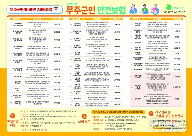 배점옥 무주군청 안전재난과 안전민방위팀장은 “무주군민이라면 별도의 절차 없이 자동으로 보험 혜택을 받을 수 있다”며 “예기치 못한 사고로 어려움에 처한 군민들이 하루빨리 일상으로 복귀할 수 있도록 든든한 뒷받침 역할을 하겠다”고 말했다.