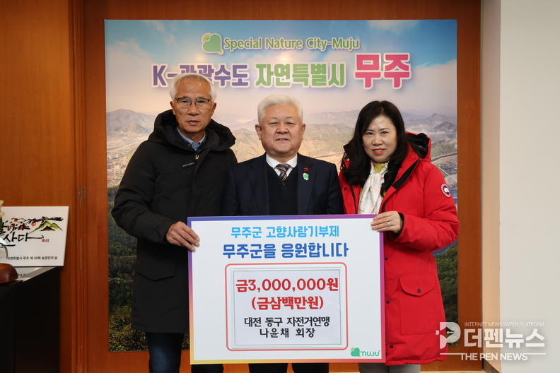 나 회장은 지난 26일 무주군청을 방문해 고향사랑기부금 3백만 원을 기탁하며 “나고 자란 고향 무주를 한 번도 잊은 적이 없다. 언제나 무주가 발전하고 이웃들이 행복하기를 바라는 마음에서 기부를 결심했다”고 밝혔다.