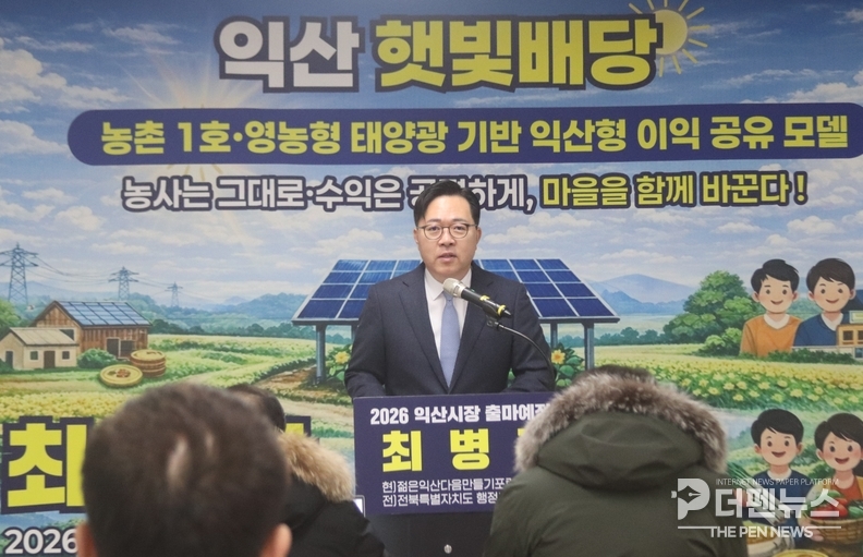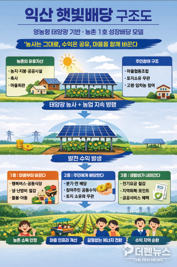이 가운데 최 전 부지사가 첫 실행 모델로 제안한 것은 영농형 태양광 기반의 ‘익산 햇빛배당’이다. 농지 위에 태양광 설비를 설치해 농사와 발전을 병행하고, 그 수익을 마을과 주민에게 배당하는 방식이다. 그는 “농업을 지키면서도 농촌에 안정적인 현금 흐름을 만드는 구조”라며 “농촌에서 시범적으로 검증한 뒤 에너지와 산업, 도시 영역으로 확장할 수 있다”고 설명했다.
