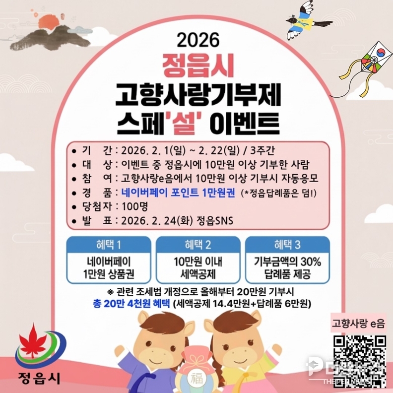정읍시가 민족 대명절 설을 맞아 고향을 찾는 출향인과 정읍을 응원하는 기부자들을 위해 ‘고향사랑기부제 설맞이 특별 이벤트’를 진행하며 기부 문화 확산에 나선다.