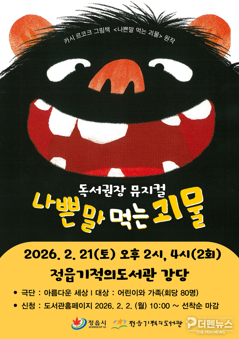 2일 정읍기적의도서관에 따르면 오는 21일 오후 2시와 4시, 총 2회에 걸쳐 온 가족이 함께 즐길 수 있는 창작 뮤지컬 ‘나쁜 말 먹는 괴물’을 무대에 올린다고 밝혔다.