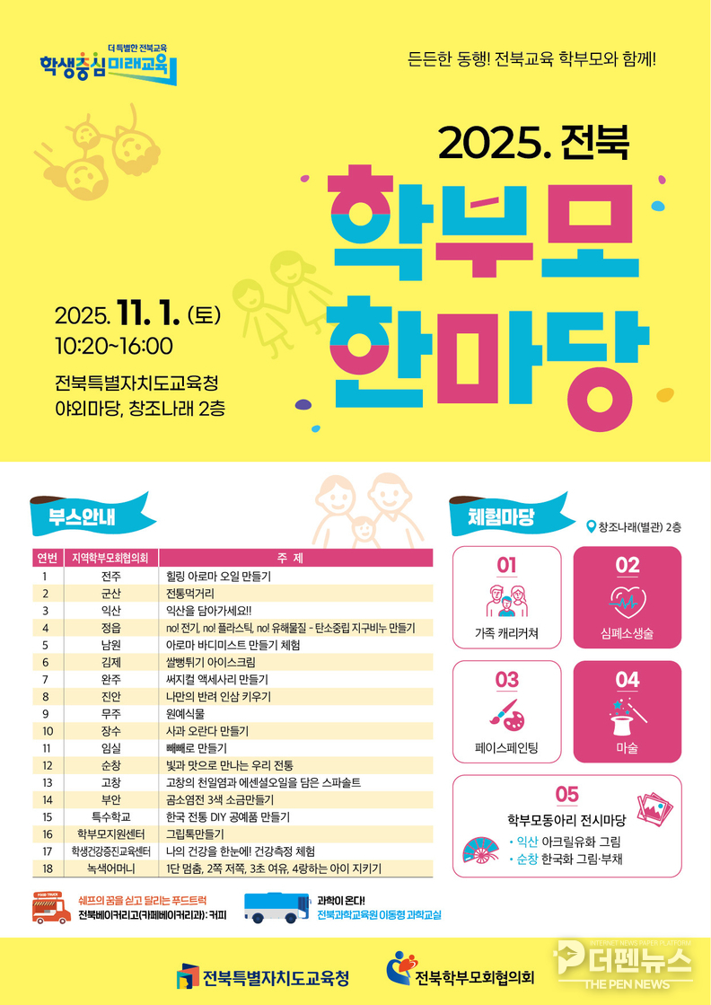 전북특별자치도교육청은 오는 11월 1일 본청 야외마당과 창조나래 2층에서 ‘2025 전북학부모한마당’을 개최한다고 29일 밝혔다. 이번 행사는 전북학부모회협의회와 공동 주최·주관으로 진행된다.