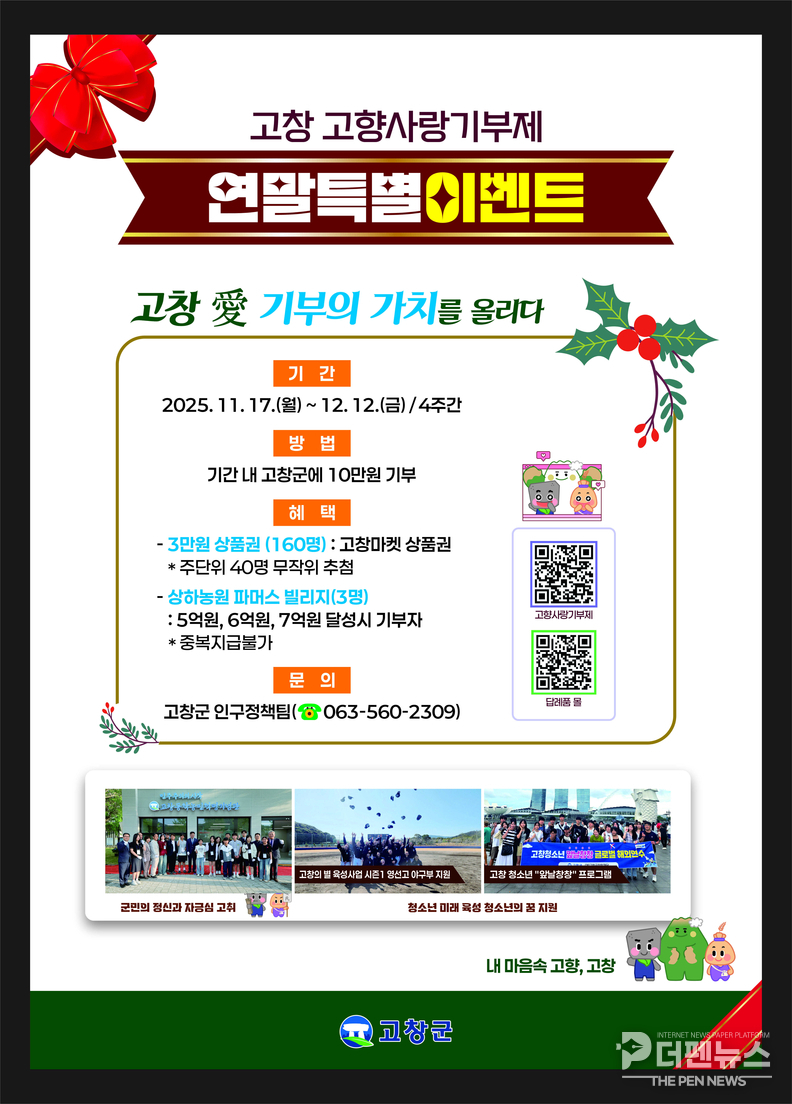고창군이 연말정산 시즌을 맞아 고향사랑기부 참여를 확대하기 위한 특별 이벤트 ‘고창愛 기부의 가치를 올리다’를 12월 12일까지 운영한다고 20일 밝혔다.