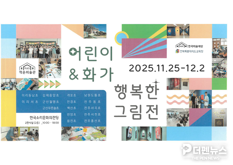 전북특별자치도교육청은 오는 12월 2일까지 한국소리문화의전당 갤러리 2전시실에서 ‘2025. 학교 안 작은 미술관 어린이&화가 행복한 그림전’을 개최한다고 26일 밝혔다.