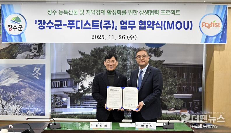 장수군이 지역 농가의 안정적 판로 확보와 농특산물 브랜드 경쟁력 강화를 위해 민간기업과 손을 잡았다. 장수군은 26일 군청 회의실에서 B2B 식자재 전문 기업 푸디스트(주)(사조그룹 계열)와 지역경제 활성화 및 상생 발전을 위한 전략적 업무협약을 체결했다고 밝혔다.