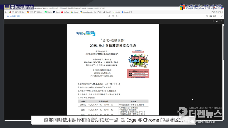 또한 한국어 문서 이해가 어려운 학부모를 위해 크롬과 엣지 브라우저 번역 기능 활용법을 실습 형태로 제시했다. 크롬에서는 학교 홈페이지 및 공지사항을 자동 번역하는 방법을 자세히 소개하고, 엣지 브라우저에서는 번역된 문서를 음성으로 들을 수 있는 ‘읽어주기(read aloud)’ 기능까지 안내해 접근성을 크게 높였다.