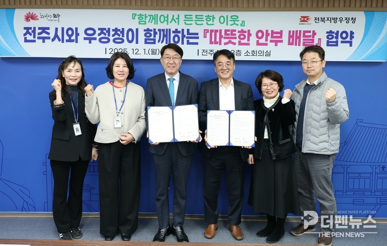 전주시와 전북지방우정청이 1일 시청 3층 소회의실에서 ‘따뜻한 안부 배달’ 업무협약을 체결하고, 집배원을 통한 독거노인 등 취약계층 안부 확인 및 반찬 지원에 나선다. 이날 협약식에는 우범기 전주시장과 최승만 전북지방우정청 청장 직무대리 등 양 기관 관계자들이 참석했다.