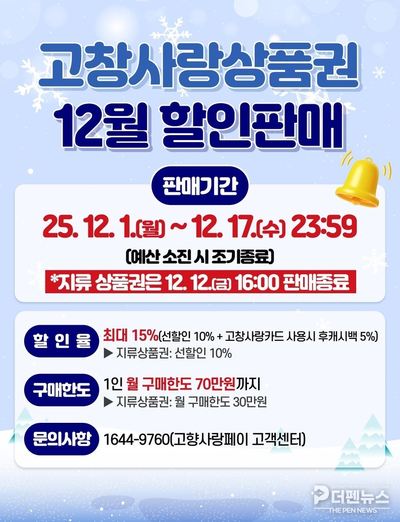 군 관계자는 “고창사랑상품권이 지역경제를 떠받치는 핵심 소비 플랫폼으로 자리 잡고 있다”며 “연말 할인 행사를 통해 군민과 소상공인 모두에게 실질적 도움이 되도록 운영하겠다”고 말했다.
