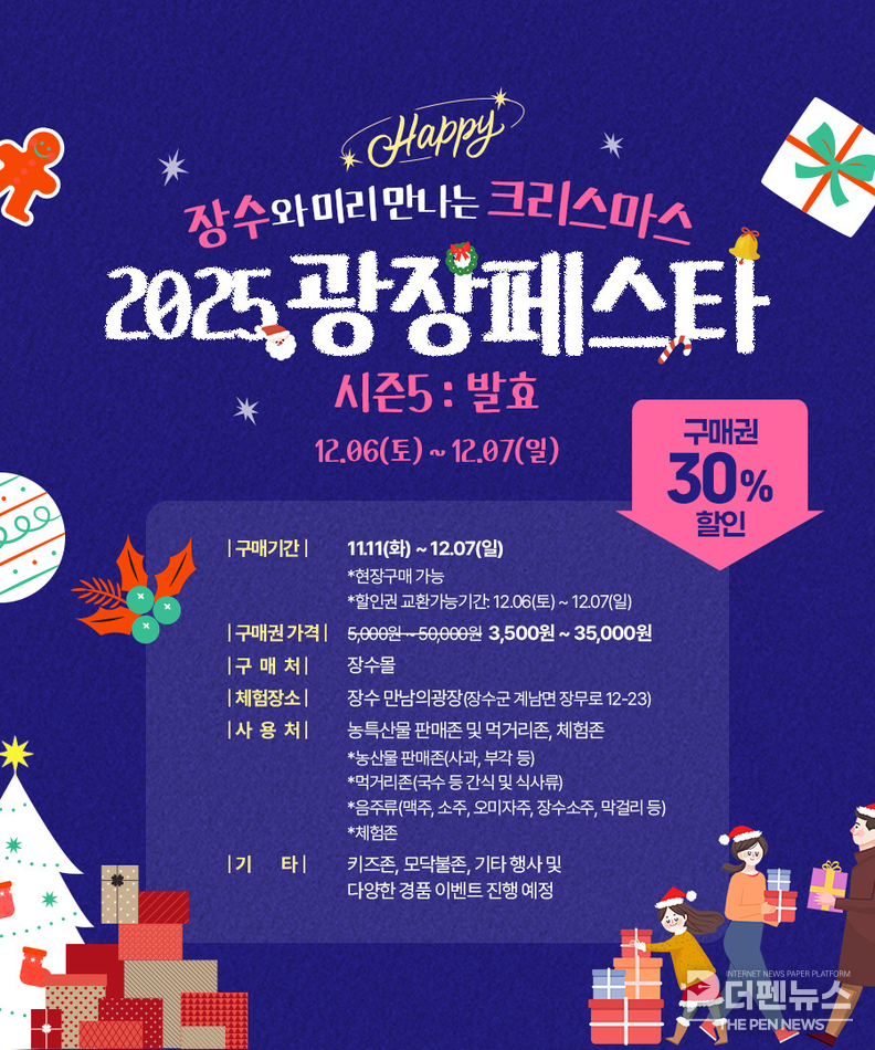 장수군이 올해 마지막 광장페스타로 마련한 ‘시즌5: 미리크리스마스’ 축제를 6일부터 7일까지 이틀간 만남의광장(더레드하우스 앞)에서 개최한다. 여름 시즌의 ‘맥주 페스타’로 시작된 올해 광장페스타 시리즈는 막걸리, 장류, 김장 체험 등 다양한 주제로 운영되며 군민과 방문객의 참여를 이끌어 왔다.