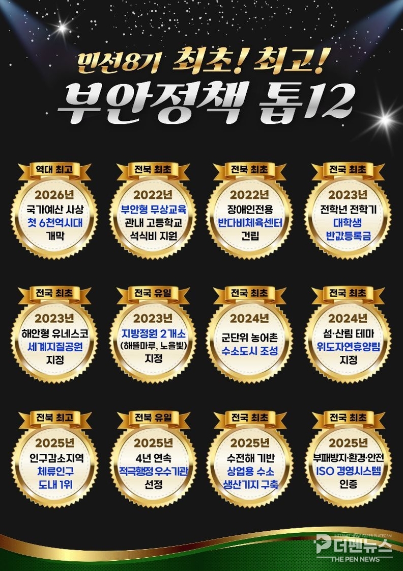 ‘최초·최고 부안정책 톱12’에는 사상 처음으로 국가예산 6000억 원 시대를 연 성과를 비롯해 ▲전국 최초 대학생 전 학년·전 학기 반값등록금 실현 ▲전국 최초 해안형 유네스코 세계지질공원 지정 ▲전국 최초 군 단위 농어촌 수소도시 조성 ▲전북 최고 인구감소지역 체류인구 도내 1위 ▲전북 유일 4년 연속 적극행정 우수기관 선정 등 굵직한 정책들이 포함됐다.