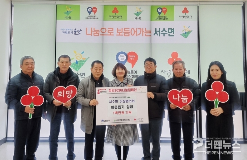 서수면 이장협의회는 지난해에 이어 올해도 이웃사랑 나눔에 동참하며 지역사회에 따뜻한 온기를 전했다. 이번 성금은 지역 주민의 봉사자로서 마을을 보듬고 있는 이장들이 자발적으로 뜻을 모아 마련한 것으로, 오는 31일까지 진행 중인 ‘희망 2026 나눔 캠페인’의 의미를 더했다.