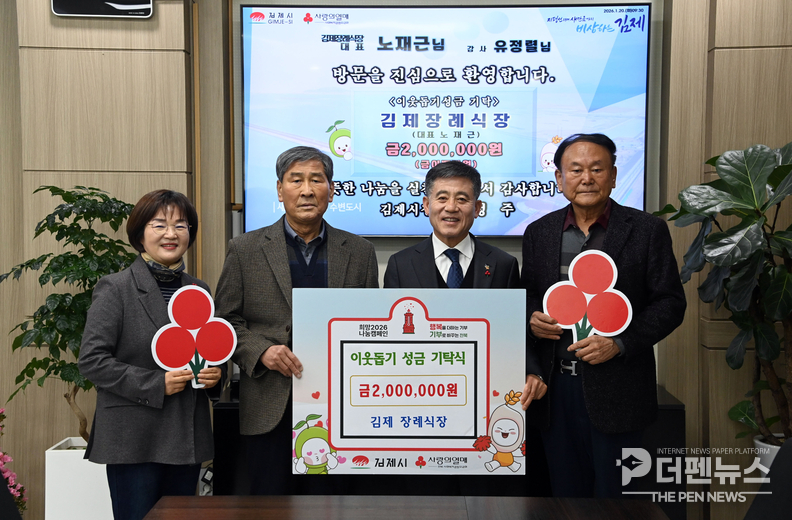 정성주 김제시장은 “매년 잊지 않고 따뜻한 나눔을 실천해 주시는 김제장례식장에 진심으로 감사드린다”며 “기탁된 성금은 도움이 필요한 이웃들에게 소중히 전달해 따뜻한 지역사회를 만드는 데 쓰겠다”고 밝혔다.