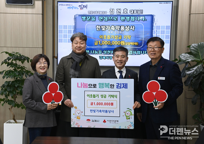 김제시는 한빛가축약품상사(대표 김건호)가 지난 20일 이웃돕기 성금 100만원을 기탁하며 ‘희망2026 나눔캠페인’에 동참했다고 밝혔다.