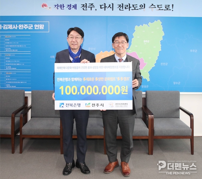 JB금융그룹 전북은행은 20일 전주시청 시장실에서 전주시와 함께 다문화가정 아동 겨울방학 프로그램인 ‘다다캠프(다채로운 다문화 캠프)’ 운영을 위한 성금 전달식을 열고, 전주시에 1억 원을 기부했다.