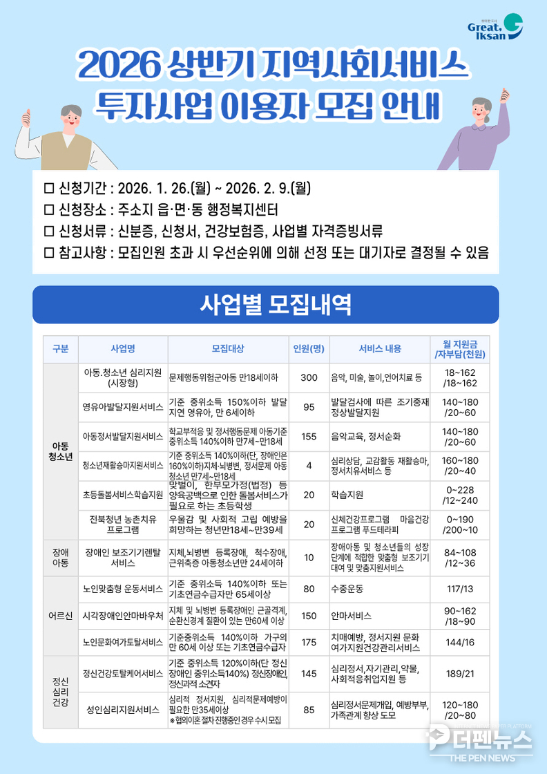 익산시는 오는 26일부터 2월 9일까지 ‘2026년 상반기 지역사회서비스 투자사업’ 이용자를 모집한다고 밝혔다. 이번 사업은 복지 사각지대를 해소하고 시민의 삶의 질을 높이기 위해 마련됐다.
