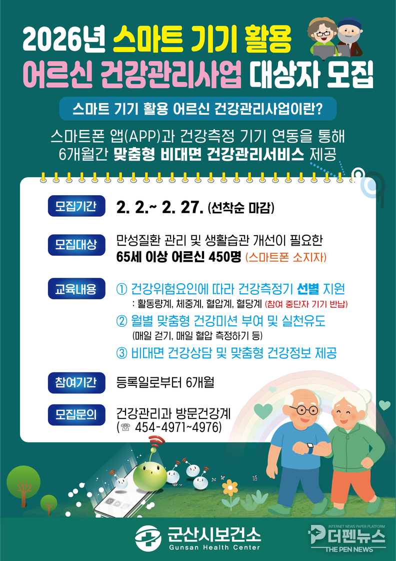 군산시보건소는 오는 2월 2일부터 ‘스마트 기기 활용 어르신 건강관리사업’ 참여자 450명을 선착순으로 모집한다고 밝혔다.