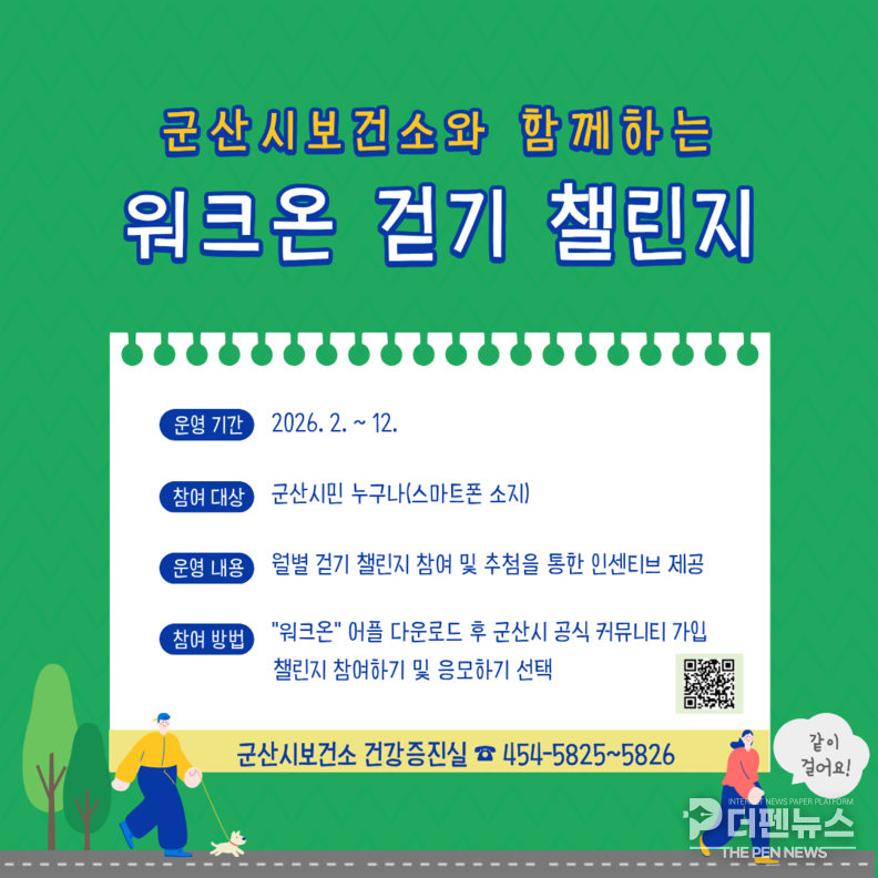 월별 챌린지 일정과 세부 운영 내용은 ‘워크온’ 앱 내 군산시 공식 커뮤니티에서 확인할 수 있으며, 참여 방법과 관련한 자세한 사항은 군산시보건소 건강증진실(063-454-5825~5826)로 문의하면 된다.