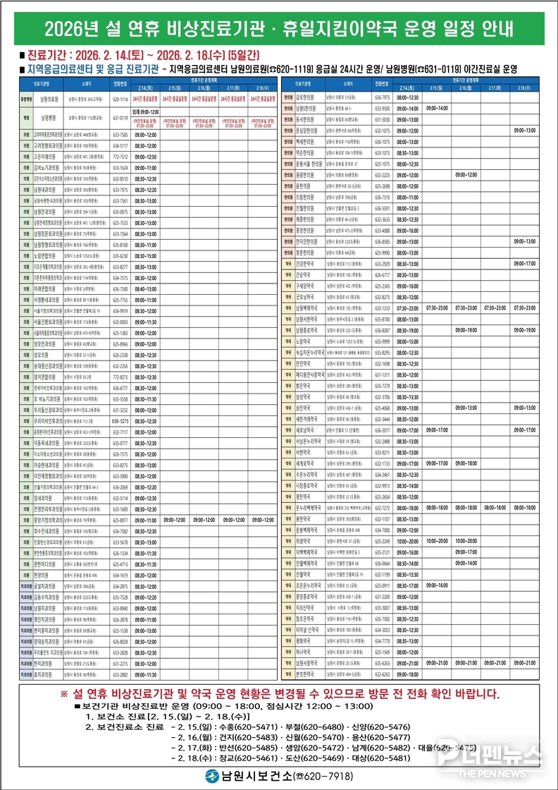 남원시 관계자는 “설 연휴에도 시민들이 안심하고 의료서비스를 이용할 수 있도록 비상진료체계를 철저히 운영하겠다”며 “응급상황 발생 시에는 119를 이용하고, 경증 질환은 문 여는 의료기관과 약국을 적극 활용해 달라”고 당부했다.