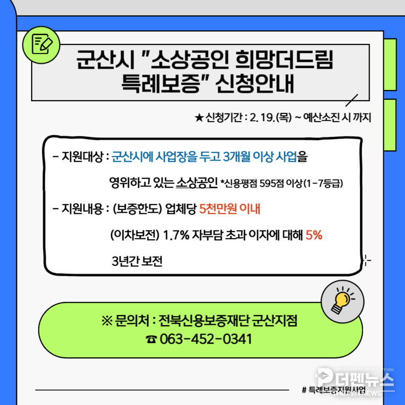 이헌현 군산시 일자리경제과장은 “특례보증과 경영 지원 정책이 소상공인에게 실질적인 버팀목이 되길 기대한다”며 “현장 중심 정책을 강화하겠다”고 밝혔다.