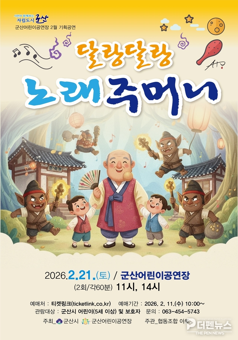 군산예술의전당관리과는 “전래동화의 교훈성과 국악의 흥미 요소를 함께 담은 공연”이라며 “어린이 눈높이에 맞춘 문화예술 콘텐츠를 지속적으로 확대하겠다”고 밝혔다.