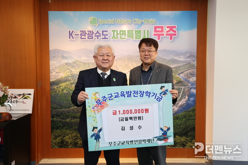 무주군은 김성수 부장이 지난 12일 (재)무주군교육발전장학재단에 장학금 100만원을 전달했다고 밝혔다.