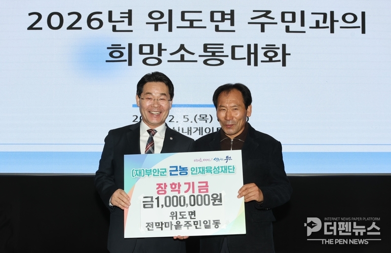 부안군은 위도 게이트볼장에서 열린 ‘2026년 위도면 군민과의 희망소통대화’ 행사에서 장학금 기탁식이 진행됐다고 밝혔다.