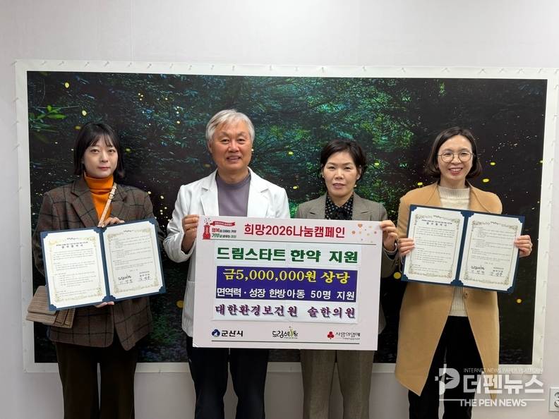 강성용 솔한의원 원장은 “지역 아동들이 건강하게 성장하는 데 보탬이 되길 바란다”고 말했다. 군산시 관계자는 “아동의 면역력 증진과 성장기 건강 기반 강화를 위한 맞춤형 지원을 이어가겠다”고 밝혔다.