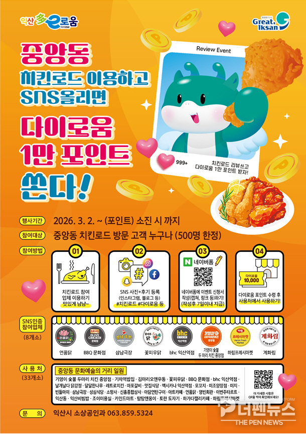 참여를 원하는 시민은 해당 매장에서 촬영한 음식 사진이나 영수증, 영상 등을 개인 SNS에 필수 해시태그 ‘#치킨로드’, ‘#다이로움’과 함께 게시하면 된다. 이후 네이버폼 신청서에 인적 사항과 SNS 게시물 캡처 이미지, 링크를 제출하면 참여가 완료된다. 신청 방법은 익산시 누리집 ‘소상공인 지원사업’ 게시판에서 확인할 수 있다.