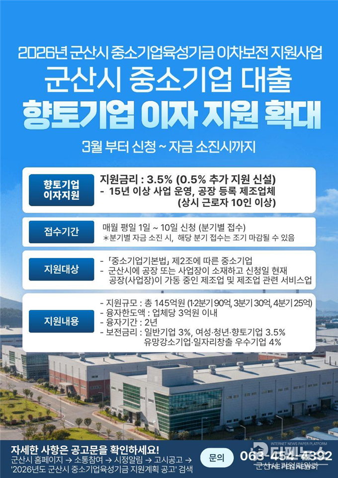 시 관계자는 “향토기업은 지역경제의 핵심 축”이라며 “금리 우대를 통해 금융 부담을 줄이고 생산과 고용 기반이 흔들리지 않도록 지원하겠다”고 말했다.