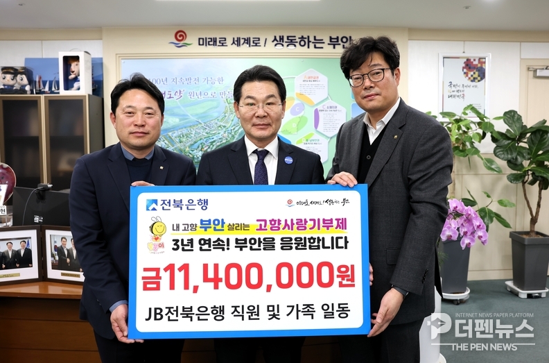 부안군은 지난 25일 전북은행 임직원 및 가족 일동이 군청을 찾아 고향사랑기부금을 전달했다고 밝혔다. 전북은행은 2023년과 2025년 각각 700만원을 기부한 데 이어 올해도 나눔을 이어가며 지역 상생에 동참하고 있다.
