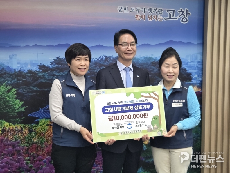 고창군은 지난 3일 군청에서 고창군 공무직노동조합과 부안군 공무직노동조합이 고향사랑기부금 1000만 원을 상호 기부하는 기탁식을 진행했다고 밝혔다.