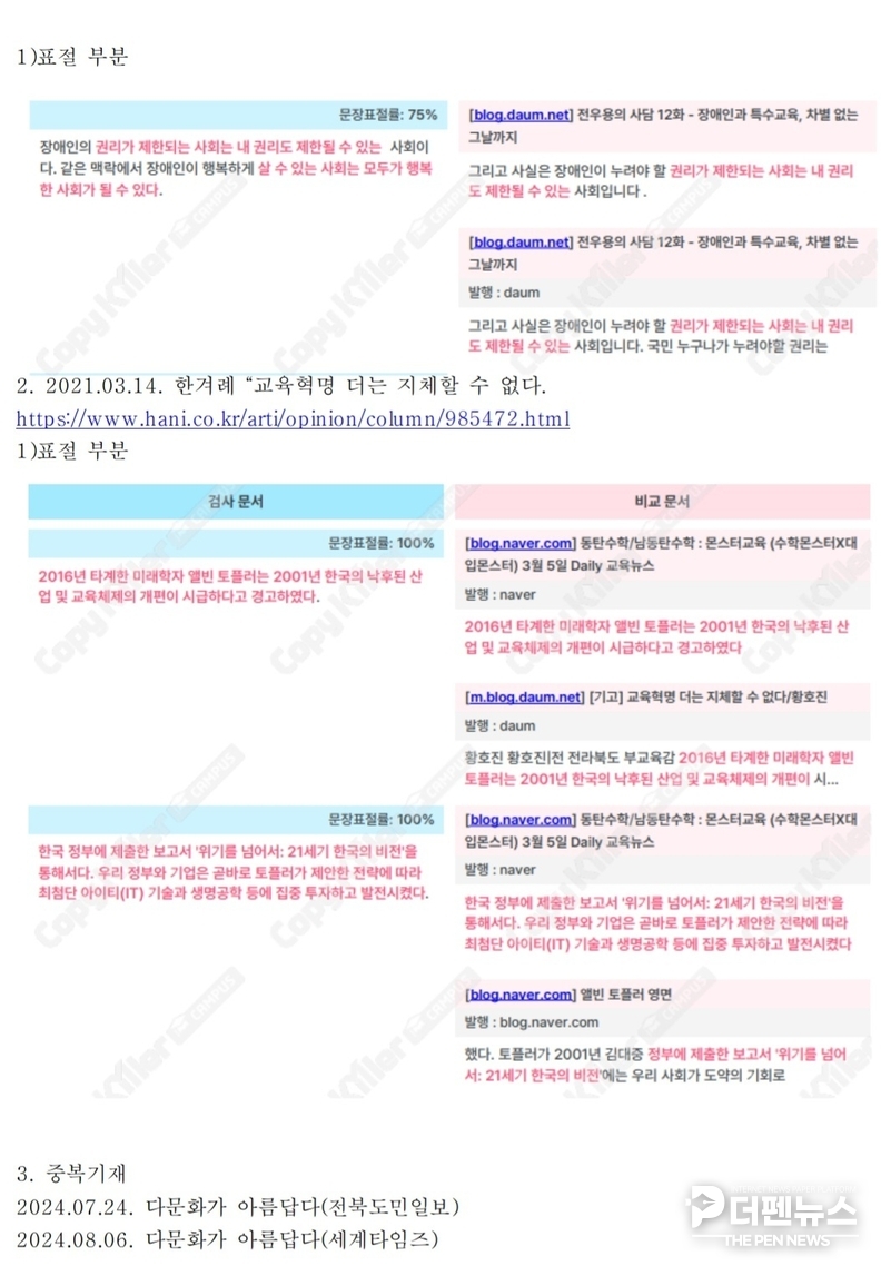 특히 미래학자 앨빈 토플러의 교육 관련 견해나 정부 정책 보고서를 인용한 일부 대목에서는 문장 구조와 표현 방식이 기존 자료와 거의 동일해 문장 일치율이 75%에서 최대 100% 수준이라는 분석 결과도 제시됐다.