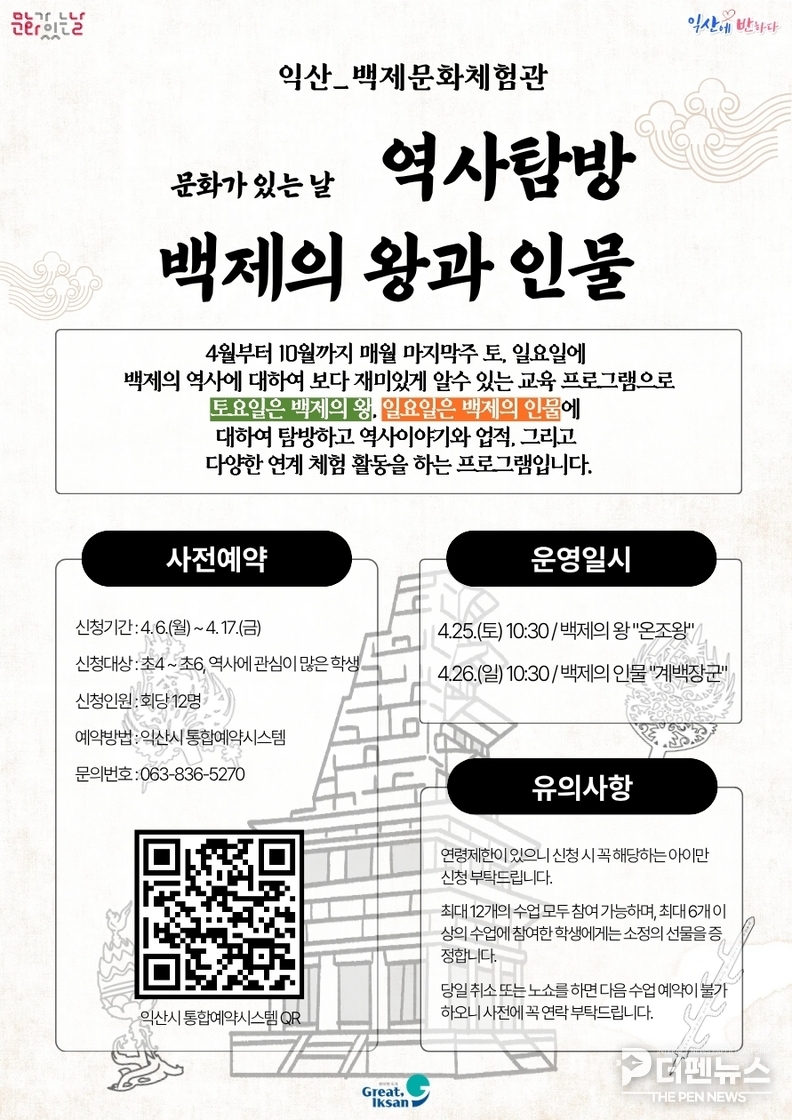 익산시는 6일 백제문화체험관에서 4월부터 10월까지 매월 마지막 주말 ‘역사탐방-백제의 왕과 인물’ 프로그램을 운영한다고 밝혔다. 체험형 교육을 통해 시민과 관광객이 백제사를 보다 입체적으로 이해할 수 있도록 구성했다.