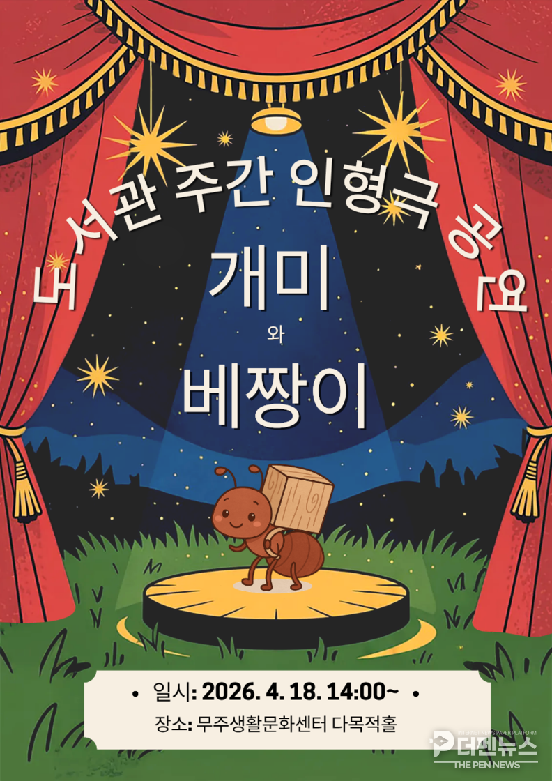 무주군은 4월 18일 오후 2시 무주생활문화센터 다목적홀에서 인형극 ‘개미와 베짱이’를 공연한다고 밝혔다. 이번 공연은 ‘배려와 존중’을 주제로, 지역 어린이들에게 친숙한 이야기를 통해 공동체 가치를 자연스럽게 전달하기 위해 마련됐다.