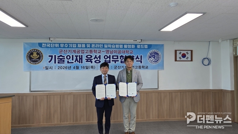 군산기계공업고등학교(교장 채정배)와 영남이공대학교(총장 이재용)가 피지컬 인공지능(AI)과 지능형 제조 분야를 선도할 차세대 기술 인재를 키우기 위해 전략적 파트너십을 맺었다. 양 기관은 지난 16일 군산기계공고 회의실에서 이 같은 내용을 골자로 한 업무협약(MOU)을 체결하고 본격적인 협력에 나섰다.