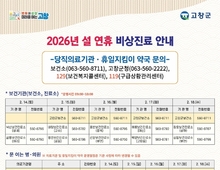 고창군이 설 연휴 기간 군민과 귀성객의 건강 보호를 위해 비상진료체계를 가동한다. 고창군은 설 연휴인 14일부터 18일까지 군민의 의료 이용 불편을 최소화하기 위해 지역 내 의료기관과 연계한 비상진료체계를 운영한다고 밝혔다. 지역응급의료기관인 고창종합병원은 연휴 기간 동안 24시간 응급실을 운영해 응급환자 발생에 대비한다. 이와 함께 보건기관 11개소, 당직 병·의원 26개소, 약국 22개소가 일자별로 지정돼 운영될 예정이다. 연휴 첫날인 14일(토요일)에는 대부분의 관내 의료기관이 오전 중 정상 진료를 실시한다. 고창군보건소를 비롯한 보건진료소 10개소는 연휴 기간 오전 9시부터 오후 6시까지 정상 진료를 이어간다. 군은 권역별 진료 지역을 나눠 운영함으로써 민간 의료기관의 진료 공백을 최소화할 방침이다. 설 연휴 기간 문을 여는 병·의원과 약국 정보는 응급의료포털(E-gen), 군 및 보건소 홈페이지, 보건복지콜센터(129), 119구급상황관리센터, 스마트폰 앱 ‘응급의료정보제공’을 통해 확인할 수 있다. 유병수 고창군보건소장은 “설 연휴 기간 동안 철저한 비상진료체계를 운영해 귀성객과 군민들이 안전하고 건강한 명절을 보낼 수 있도록 최선을 다하겠다”고