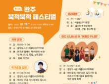 완주군이 오는 18일 완주군립중앙도서관 일원에서 ‘제12회 북(book)적 북(book)적 페스티벌’을 개최하며, 책과 사람, 이야기가 어우러지는 독서문화 축제를 선보인다. 올해 축제는 ‘다정한 책, 북적이는 이야기들’을 슬로건으로 내세워 세대와 지역을 연결하는 다양한 프로그램을 진행한다. 완주군과 책읽는지식도시완주 추진위원회가 공동 주최하는 이번 행사는 군민 누구나 즐길 수 있는 책 문화 한마당이 될 예정이다. 주요 프로그램으로는 ▲완주군 올해의 책 《언제나 다정 죽집》 낭독 공연 ▲김민섭 작가 초청 강연 ▲국립어린이청소년도서관과 함께하는 ‘책 읽어주세요’ 캠페인 ▲체험 프로그램 20종 ▲공연(밴드 신나는섬, 솜사탕 공연) ▲플리마켓 등이 마련됐다. 특히 어린이 부문에서는 《언제나 다정 죽집》과 연계한 ‘다정 죽집 부엌 친구들에게 메시지 전하기’, 북큐레이션 ‘언제나 다정 책집’, 포토존 ‘오늘, 당신에게 필요한 죽’ 등 체험형 프로그램이 눈길을 끈다. 성인 부문에서는 올해의 책 《작은 빛을 따라서》와 연계해 책 속 문구를 활용한 마스킹테이프 책갈피 만들기 체험이 진행된다. 또한 국립어린이청소년도서관과 협력하는 ‘책 읽어주세요’ 캠페인에서는 그림책 작가 김
