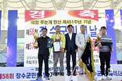 장수군이 지난 23일 장수종합경기장에서 의암 주논개 탄신 제451주년 기념 ‘제58회 장수군민의 날 기념식’과 ‘제57회 장수군민 체육대회’를 성황리에 마무리했다. 이번 행사는 장수군의 대표 역사 인물인 의암 주논개의 충절과 애국정신을 기리고, 군민의 단합과 화합을 도모하기 위해 매년 주논개 탄신일인 음력 9월 3일에 맞춰 열리고 있다. 이날 행사에는 최훈식 장수군수, 최한주 군의회의장과 의원, 관내 기관·사회단체장, 지역주민과 선수단 등 1,000여 명이 참석해 자리를 빛냈다. 기념식은 식전공연을 시작으로 선수단 입장식 ,국민의례 ,군민헌장 낭독 ,군정발전유공자 표창 ,명예군민증 수여 ,군민의 장 시상 ,기념사 및 축사 ,논개상 추대자 소개 순으로 진행됐다. 이날 군정발전유공 표창에는 지역 발전과 명예 제고에 기여한 정연길(이티바이오텍 대표), 이수민(NH농협 장수군출장소장) 씨가 수상했으며, 김준오 NH농협 전 장수군지부장은 장수군 명예군민증을 받았다. 또한 제43회 장수군민의 장 수상자로는 문화체육장 오재영(77세) ,산업공익장 이정관(64세) ,향장 이종순(67세) ,효열장 한병원(73세) 씨가 선정돼 영예를 안았다. 기념식 후 열린 체육대회에서는 읍
