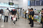 민족 대명절 추석을 맞아 고향을 찾은 귀성객들을 위한 따뜻한 환영 행사가 정읍역 광장을 훈훈하게 물들였다. 정읍시와 정읍시애향운동본부는 4일 정읍역에서 귀성객들에게 고향의 정을 나누는 환영 행사를 열었다. 이날 행사에는 이학수 시장, 박일 시의회 의장, 도·시의원, 김적우 애향운동본부 이사장과 임원, 관계 공무원이 함께 참여해 귀성객들에게 감사 인사를 건네며 고향의 따뜻한 첫인상을 선사했다. 애향운동본부 회원들은 정성껏 준비한 쌍화차, 귀리, 모둠떡, 복분자주 등 정읍의 특산품을 나누며 장거리 이동으로 지친 귀성객들의 피로를 달래주었다. 한편 시청 직원들은 고향사랑기부제 홍보 부스를 운영하며, 고향 발전에 동참할 수 있는 참여 방법을 안내했다. 김적우 이사장은 “오랜만에 고향을 찾은 분들의 발걸음이 더 가볍고 따뜻하길 바라는 마음으로 정읍의 맛과 향이 담긴 선물을 준비했다”며 “정읍의 인심을 듬뿍 느끼시고 가족과 함께 풍성한 한가위를 보내시길 기원한다”고 전했다. 이학수 시장은 “명절을 맞아 고향을 찾아주신 모든 분께 진심으로 감사드린다”며 “여러분의 방문은 정읍 발전의 큰 힘이 된다. 고향의 따뜻한 정을 느끼고, 변화하는 정읍의 자부심을 함께 가져가시길 바