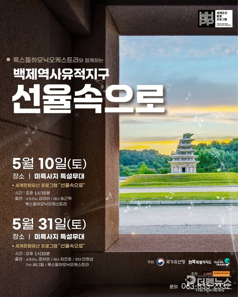 '백제역사유적지구 선율속으로'는 오는 10일 오후 1시 30분 미륵사지 특설무대에서 첫 공연이 열린다. 룩스필하모닉오케스트라와 함께 소프라노 김아라, 팬텀싱어 출신 테너 송근혁 등이 출연해 창작곡과 영화 OST, 클래식 갈라공연으로 이뤄진 감동적인 무대를 선보인다.