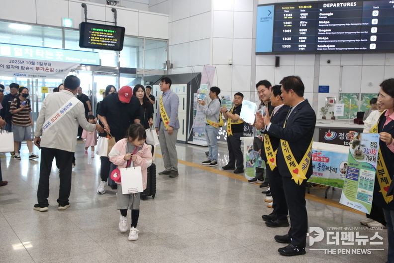 정읍시와 정읍시애향운동본부는 4일 정읍역에서 귀성객들에게 고향의 정을 나누는 환영 행사를 열었다.