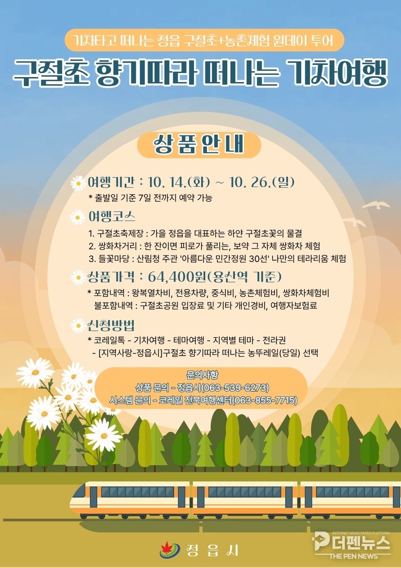 정읍시농업기술센터가 가을 여행철을 맞아 구절초 꽃축제와 농촌체험을 결합한 기차여행 상품 ‘농뚜레일 투어’ 참가자를 모집한다. 모집 기간은 오는 19일까지이며, 신청은 코레일 공식 홈페이지(www.korail.com)에서 가능하다.
