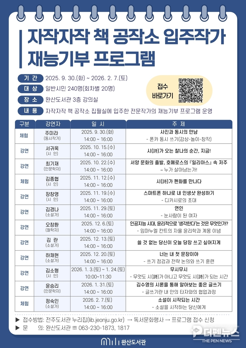박남미 전주시 도서관평생학습본부장은 “이번 프로그램은 전문작가들이 시민과 직접 만나 지식과 경험을 나누는 뜻깊은 자리”라며 “많은 시민이 참여해 글 쓰는 창작의 기쁨을 함께 나누길 바란다”고 말했다.