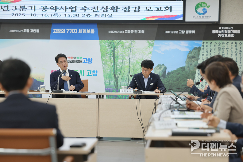 군은 지난 16일 군청 2층 회의실에서 ‘2025년 3분기 공약사업 추진상황 보고회’를 열고, 공약사업별 추진 실적과 향후 계획을 점검했다. 이날 보고회는 심덕섭 고창군수 주재로, 부군수와 국장, 부서장 등 30여 명이 참석한 가운데 진행됐다.