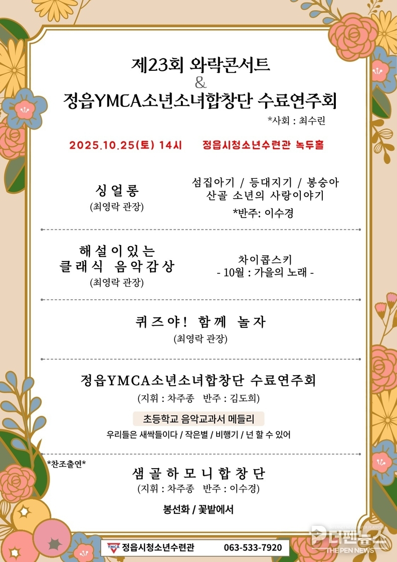 공연은 관객과 함께 노래하는 싱어롱 무대를 시작으로 ▲해설이 있는 클래식 음악 감상(차이콥스키 ‘10월: 가을의 노래’) ▲퀴즈 한마당 ▲정읍YMCA소년소녀합창단의 수료 연주회 등 다채로운 프로그램으로 구성됐다. 또한 샘골하모니합창단이 찬조 출연해 풍성한 하모니로 무대를 한층 빛낼 예정이다.