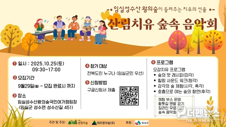임실군이 오는 25일 성수산 왕의숲 국민여가캠핑장 일원에서 ‘성수산 왕의숲 산림치유 숲속 음악회’를 개최한다.