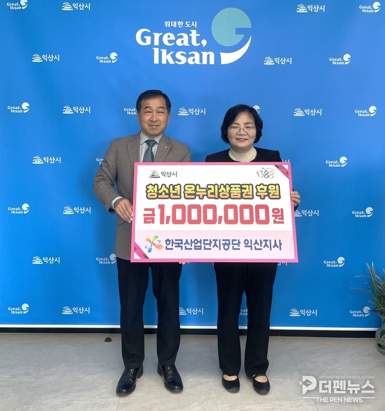 한국산업단지공단 익산지사(지사장 임찬호)는 29일 온누리상품권 100만 원을 익산시청소년상담복지센터에 전달했다. 이번에 전달된 상품권은 센터에 등록된 학교 밖 청소년과 저소득층 청소년들에게 지원될 예정이다.