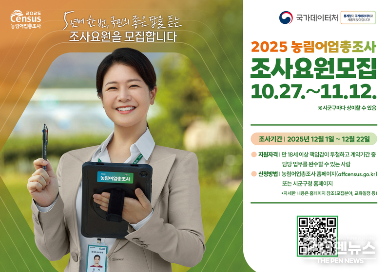 이번 조사는 현재 진행 중인 ‘2025 인구주택총조사’(10월 22일~11월 18일)에 이어 실시되는 5년 주기 전국 단위 통계조사로, 농림어가의 규모와 분포, 구조, 경영형태 등을 종합적으로 파악해 국가 농림어업 정책 수립의 기초자료로 활용되는 중요한 조사다.