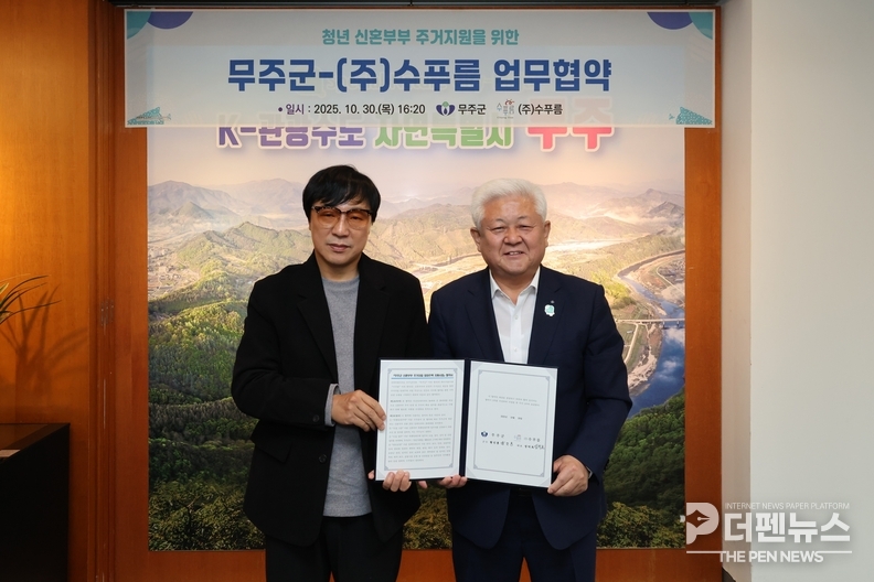 무주군은 30일 ㈜수푸름과 업무협약을 체결하고, 지역 내 신혼부부를 위한 특별공급 임대주택 28세대를 확보했다고 밝혔다. 이번 협약은 신혼부부 초기 주거 부담을 줄이고 안정적 생활 기반을 지원하기 위한 조치로 평가된다.